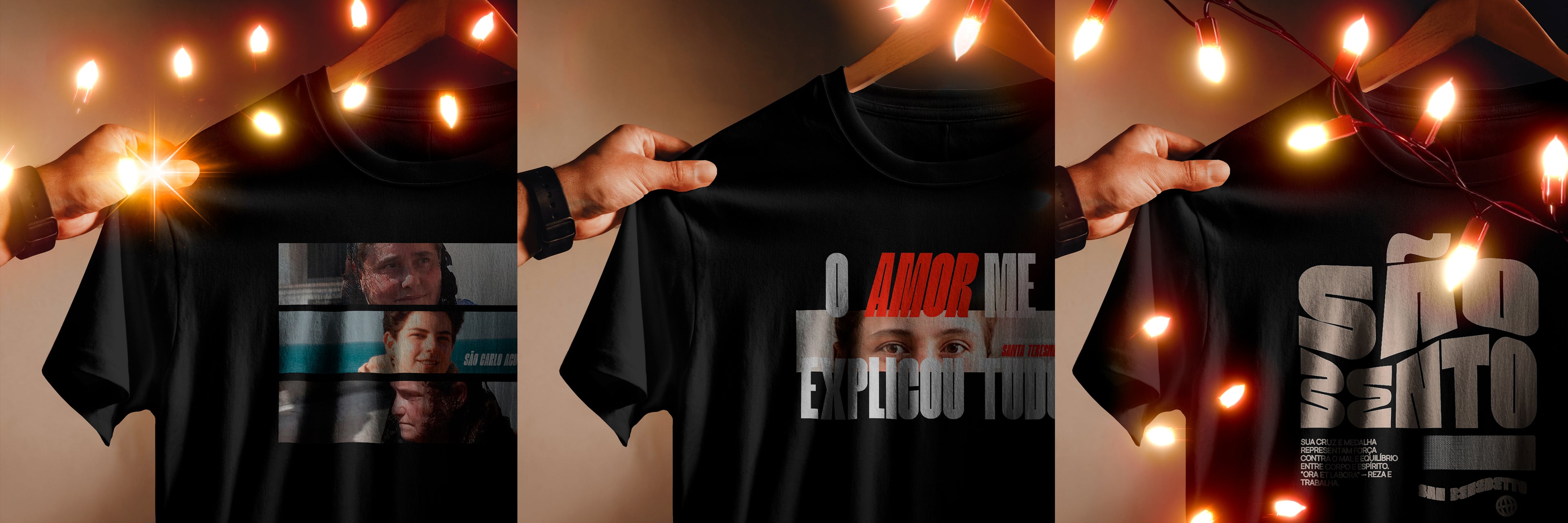 A inspiração dessa estampa nasceu da frase de São João Paulo II: ‘O amor me explicou tudo’. Porque todos os santos, quando encontraram Jesus, encontraram o Amor que transforma. E por isso a arte traz referências a ele e Santa Teresinha que viveram esse amor de formas diferentes, cada um no seu caminho, mas todos guiados pelo mesmo Amor que explica tudo.